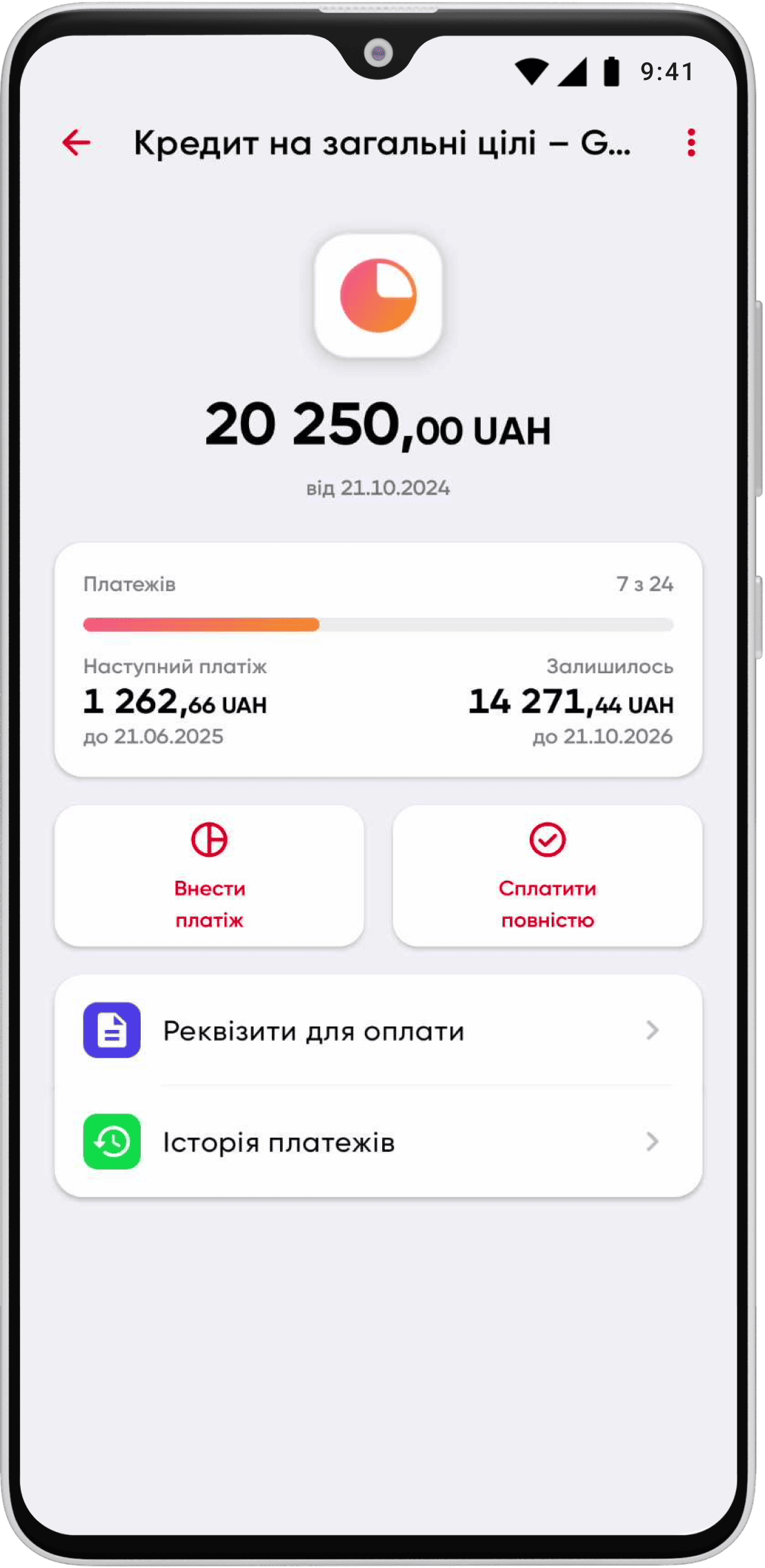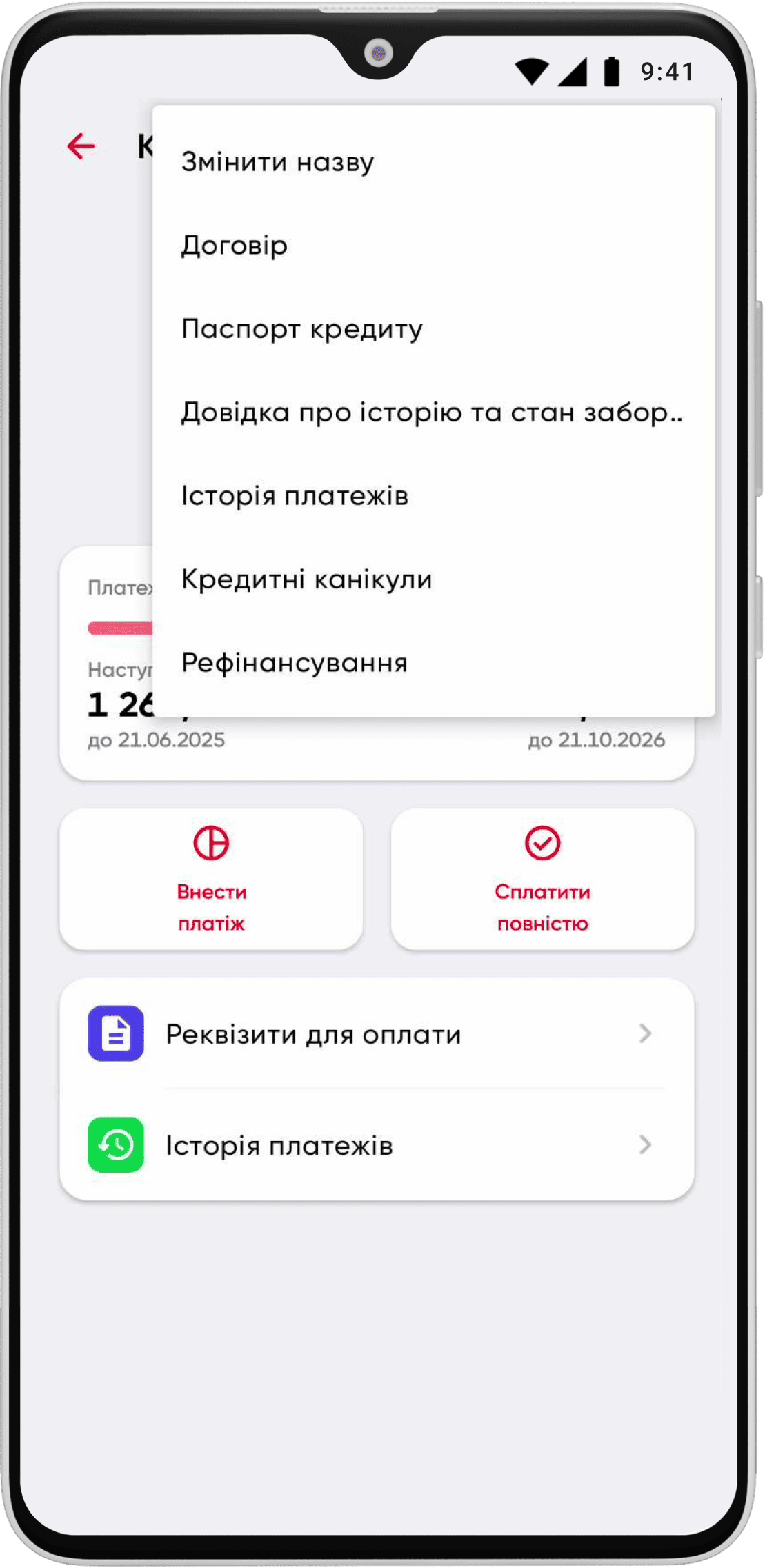 У мобільному застосунку ПУМБ в розділі «Кредити» оберіть договір, натисніть на три крапочки у правому верхньому куті