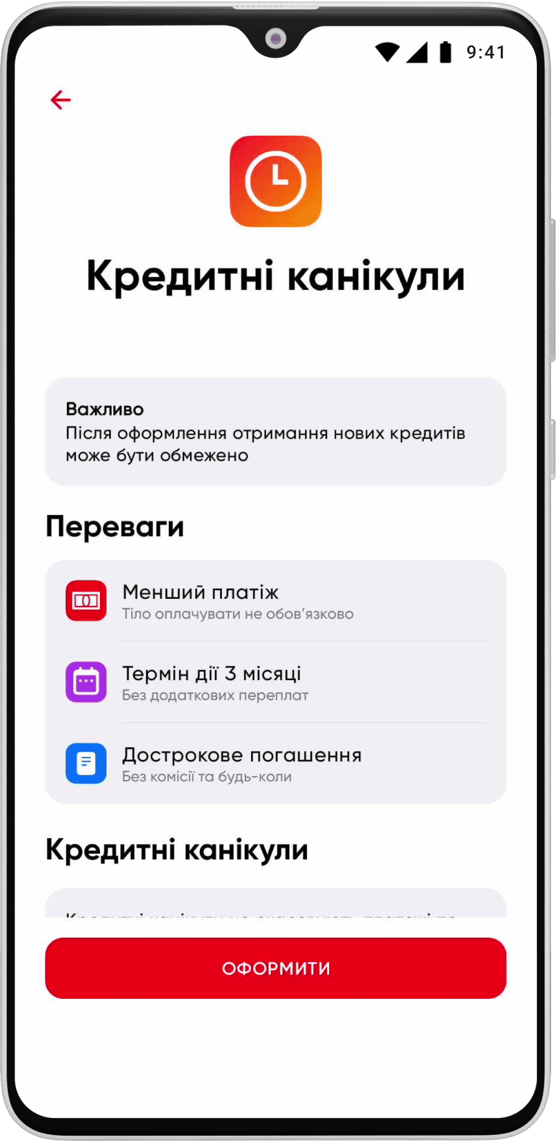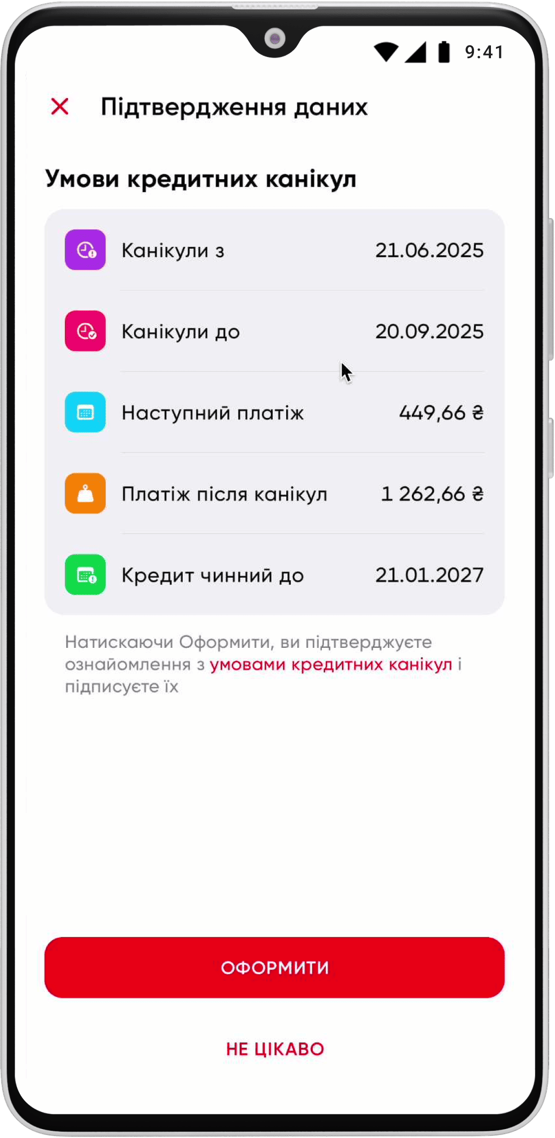 Перегляньте інформацію про платіж на час дії кредитних канікул та натисніть «Оформити»