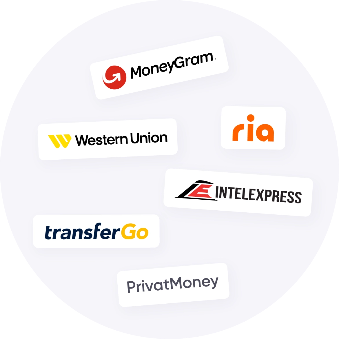 Transfer systems Western Union, MoneyGram, Ria, IntelExpress, PrivatMoney, TransferGo