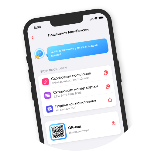 Діліться повідомленням, наприклад, у соціальних мережах, яке містить коротке посилання, номер картки, назву МаніБокс, суму збору та його опис